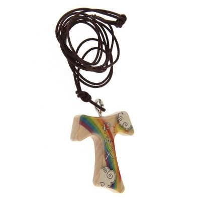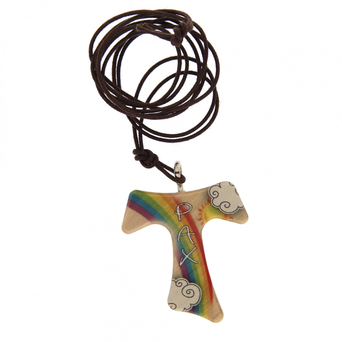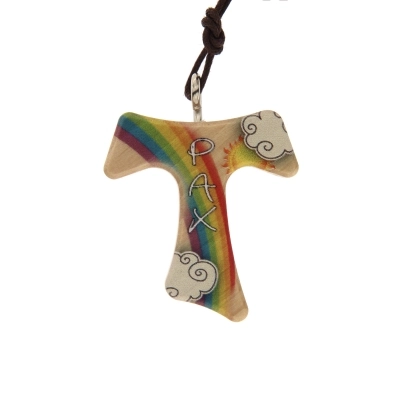 Tau in legno dalle dimensioni di 3x3,4 cm e cordoncino dalla lunghezza di 39 cm. La croce è decorata con la scritta Pax e con una grafica molto allegra e simpatica che fa da sfondo. Leggero e comodo da indossare al collo quotidianamente. Ideale da regalare anche ai bambini.
