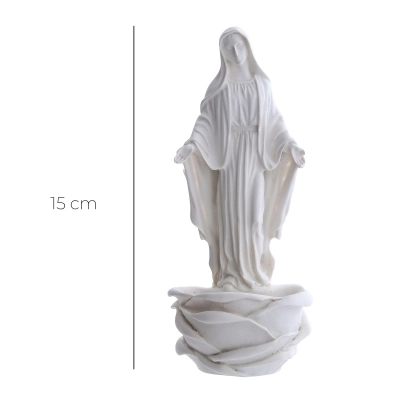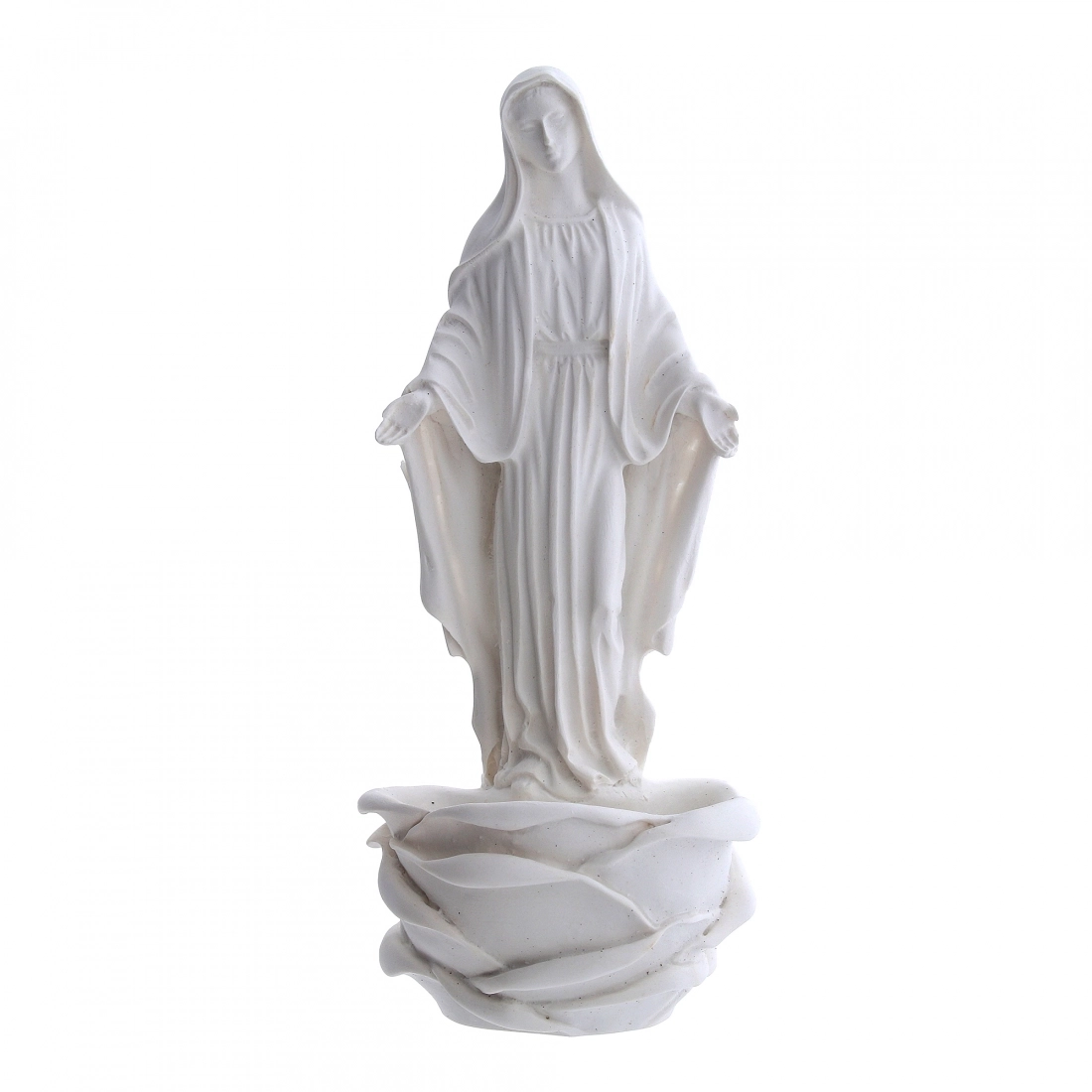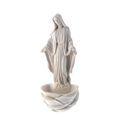 Raffinata acquasantiera in resina bianca delle dimensioni di 15x10 cm raffigurante la Madonna Immacolata. Ideale da appendere in casa e in chiesa. Può essere regalata o utilizzata come bomboniera, come segno di protezione. L'acqua santa infatti, è considerata un mezzo di purificazione e benedizione, utilizzata per proteggere e santificare le persone, gli oggetti e gli ambienti. È un simbolo di fede e di protezione spirituale per i fedeli. Inoltre, l'acquasantiera rappresenta un punto di riferimento per la preghiera e la riflessione all'interno delle chiese e delle case dei credenti.