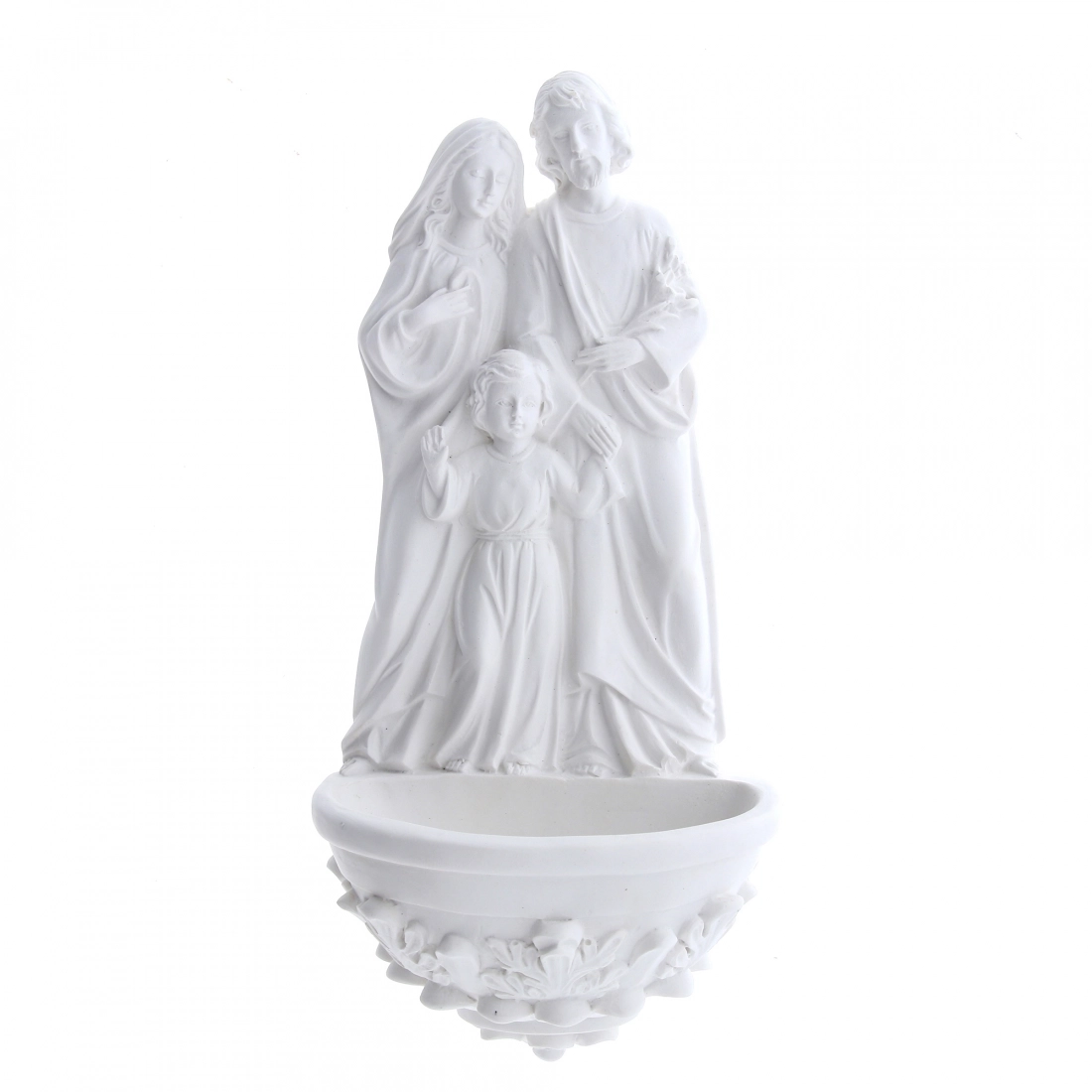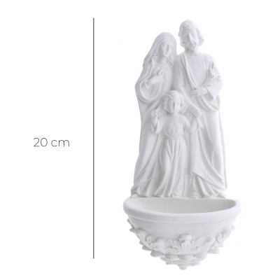 Raffinata acquasantiera in resina bianca delle dimensioni di 20x9,5 cm, raffigurante la Sacra Famiglia. Ideale da appendere in casa e in chiesa. Può essere regalata o utilizzata come bomboniera, come segno di protezione. L'acqua santa infatti, è considerata un mezzo di purificazione e benedizione, utilizzata per proteggere e santificare le persone, gli oggetti e gli ambienti. È un simbolo di fede e di protezione spirituale per i fedeli. Inoltre, l'acquasantiera rappresenta un punto di riferimento per la preghiera e la riflessione all'interno delle chiese e delle case dei credenti.
