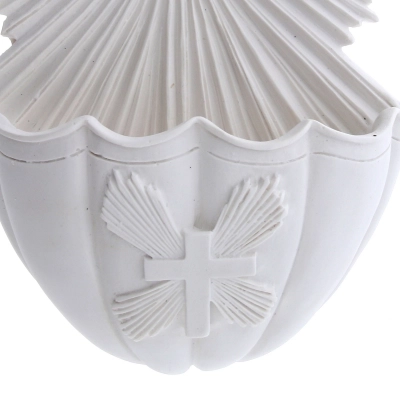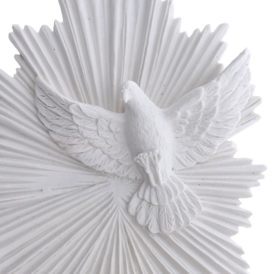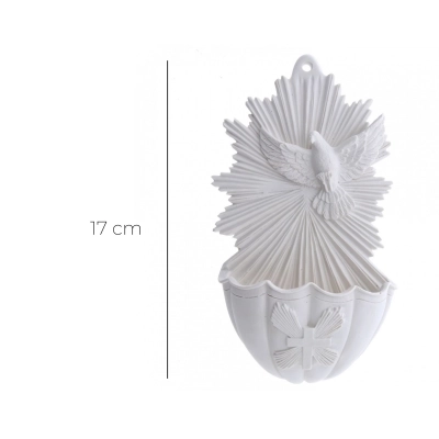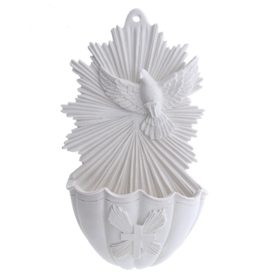Raffinata acquasantiera in resina bianca delle dimensioni di 17x9 cm, raffigurante la Colomba con raggi sullo sfondo, simbolo dello Spirito Santo. Ideale da appendere in casa e in chiesa. Può essere regalata o utilizzata come bomboniera, come segno di protezione. L'acqua santa infatti, è considerata un mezzo di purificazione e benedizione, utilizzata per proteggere e santificare le persone, gli oggetti e gli ambienti. È un simbolo di fede e di protezione spirituale per i fedeli. Inoltre, l'acquasantiera rappresenta un punto di riferimento per la preghiera e la riflessione all'interno delle chiese e delle case dei credenti.