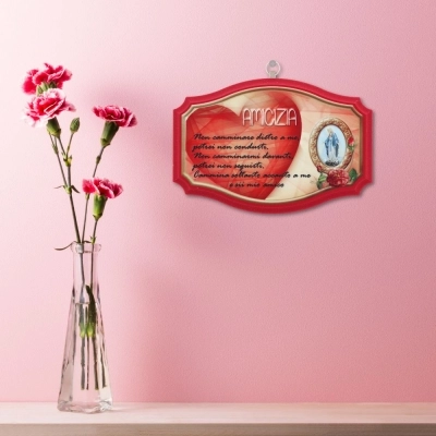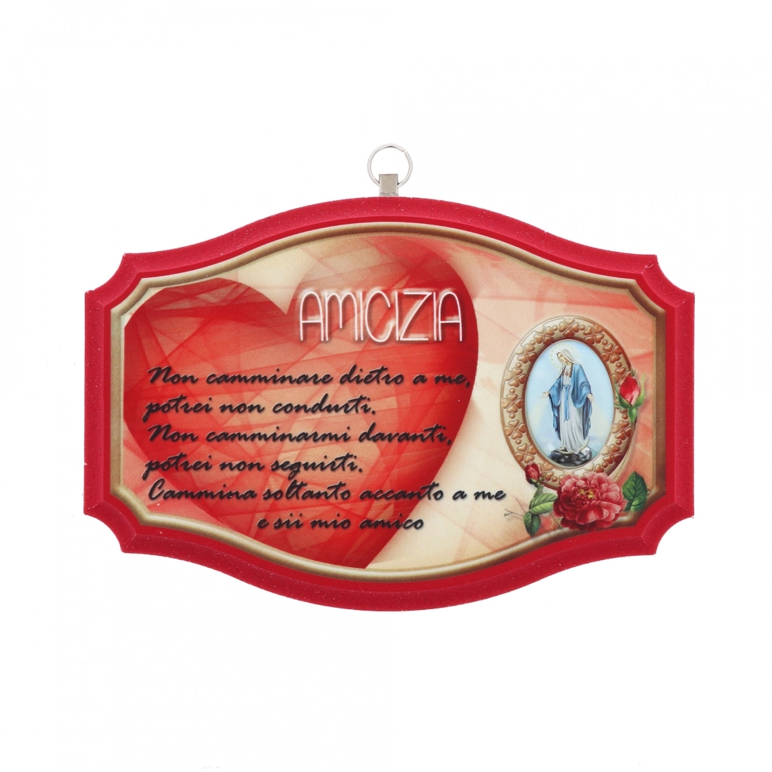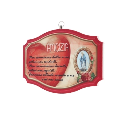 Simpatico quadretto sagomato con carinissima frase sull' Amicizia e etichetta resinata con raffigurazione della Madonna Immacolata. Questo piccolo quadro è dotato di gancetto, posto nella parte alta, che consente di appenderlo in casa. Carinissima idea regalo da donare ai propri amici in qualsiasi occasione, per rinnovare il nostro affetto per loro, ma al contempo per augurare loro la protezione della Vergine Maria.
