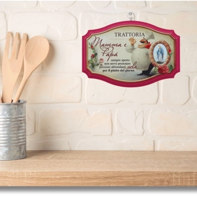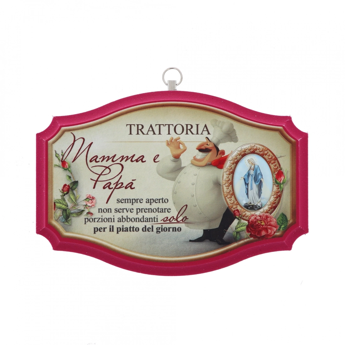 Carinissimo quadretto sagomato con simpatica frase sulle dinamiche casalinghe e familiari e etichetta resinata con raffigurazione della Madonna Immacolata. Questo piccolo quadro è dotato di gancetto, posto nella parte alta, che consente di appenderlo in casa. Carinissima idea regalo da donare in qualsiasi occasione, per rinnovare il nostro affetto, ma al contempo per augurare, a chi lo doniamo, la protezione della Vergine Maria.