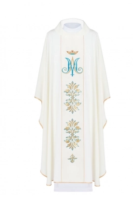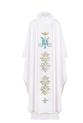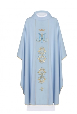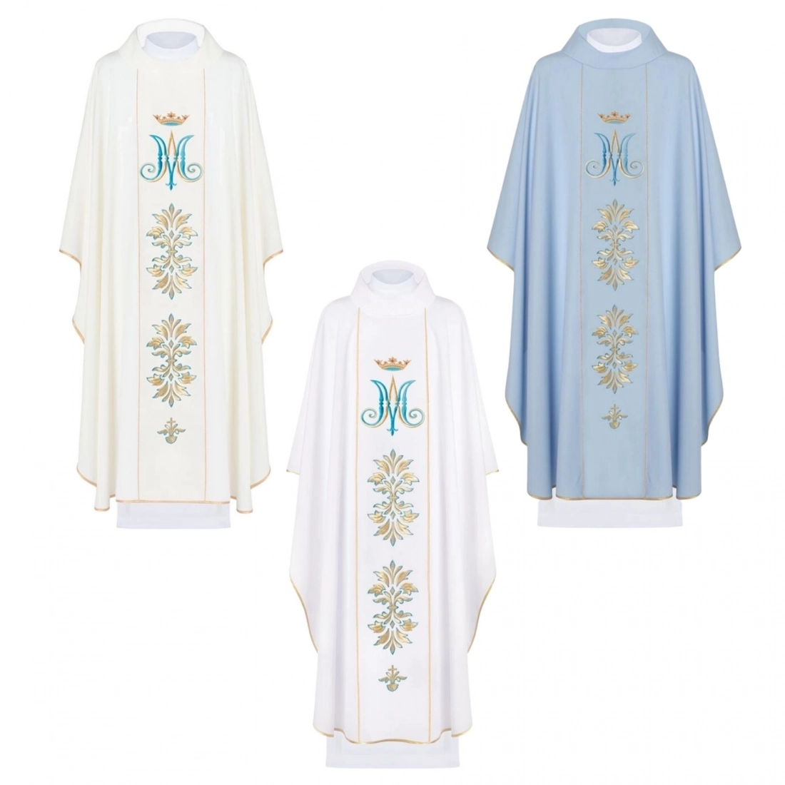 Casula sacerdotale realizzata in tessuto misto poliestere e lana, con ricamo dorato, argentato e azzurro, posto sul fascione centrale ed eseguito a macchina direttamente sul tessuto, che rappresenta la M di Maria e accompagnato da un motivo floreale che occupa tutto il fascione. Disponibile nei colori bianco e celeste. Prodotta in Polonia, da un'azienda di artigiani.