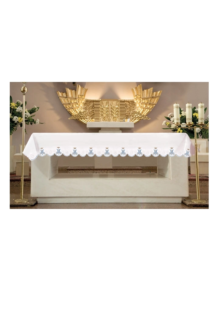 Tovaglia da altare bianca in tessuto 100% poliestere, molto semplice ed elegante con ricamate le M di Maria solo nella parte frontale e nella parte bassa della tovaglia, con bordo a merletto. La particolarità di questa tovaglia è che tra una M e l'altra ci sono dei piccoli fiori ricamati con filo bianco, il cui centro dei petali è forato. Le dimensioni totali sono 165x300 cm ed è adatta ad altari con dimensioni di 80-100 cm x 180-200 cm.