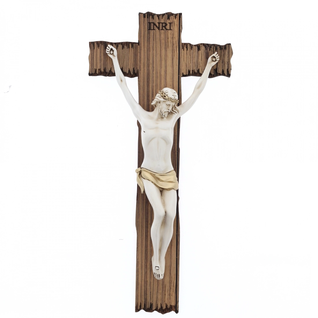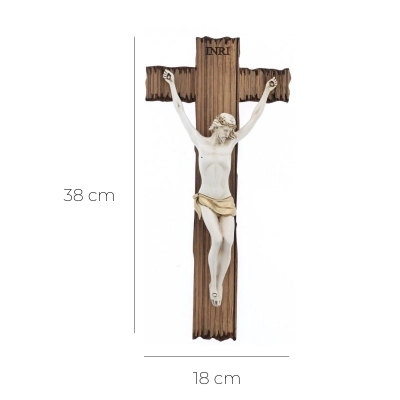 Bellissimo crocifisso, con croce in stile legno, e corpo di Cristo in resina con dettagli color oro. Dalle linee moderne, questo crocifisso unisce il disegn e il valore spirituale e simbolico che da sempre viene attribuito al crocifisso. Adatto a qualsiasi stile di arredamento, ideati per chi vuole arredare la propria casa con gusto e originalità.