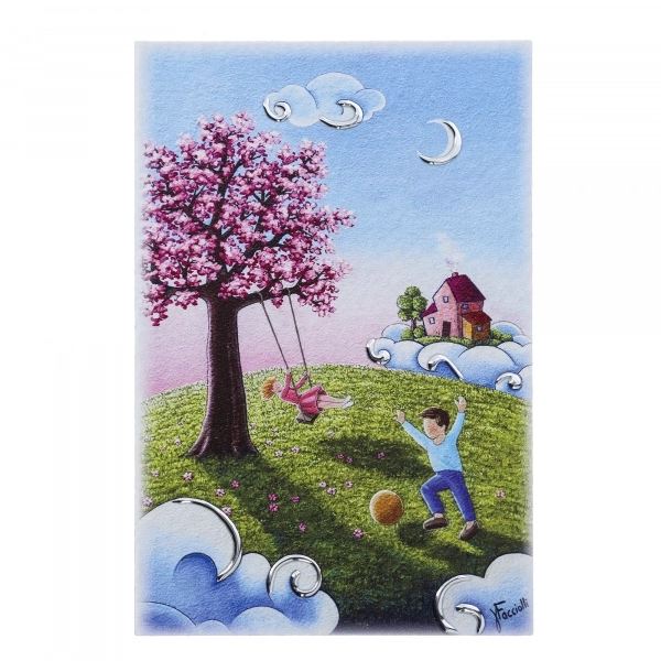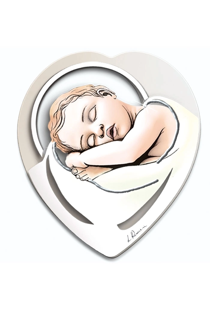 Un raffinato quadro sagomato (delle dimensioni di 30x35 cm) con la rappresentazione di Gesù Bambino che dorme. La forma del quadro ricorda un cuore. Le decorazioni argentate in rilievo sono applicate a mano da esperti artigiani. Il quadro, dai colori tenui e con gli inserti in argento, è un elegante elemento di arredo che si adatta bene all'arredamento classico o moderno. Un'ottima idea regalo in occasione di una nascita o di un Battesimo!