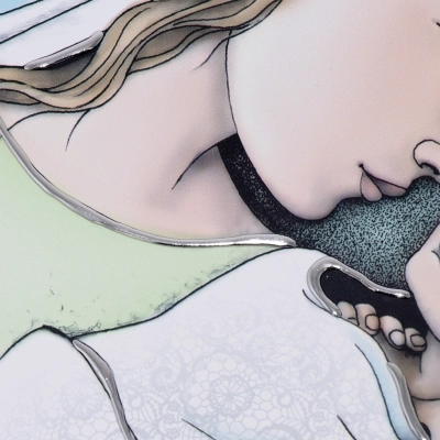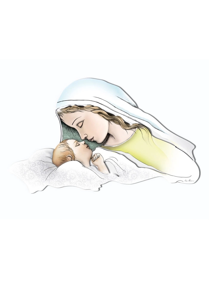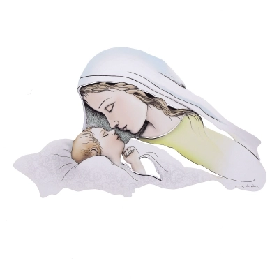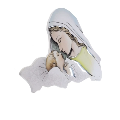 Dolce rappresentazione della Madonna con Bambino, in un quadro sagomato, delle dimensioni di 80x42 cm, con decorazioni argentate in rilievo fatte a mano. La delicatezza dell'immagine e la colorazione pastello ne fanno un elemento d'arredo raffinato e adatto a qualsiasi stile di arredamento. Ideale da regalare per un matrimonio, una nascita o per la festa della mamma!