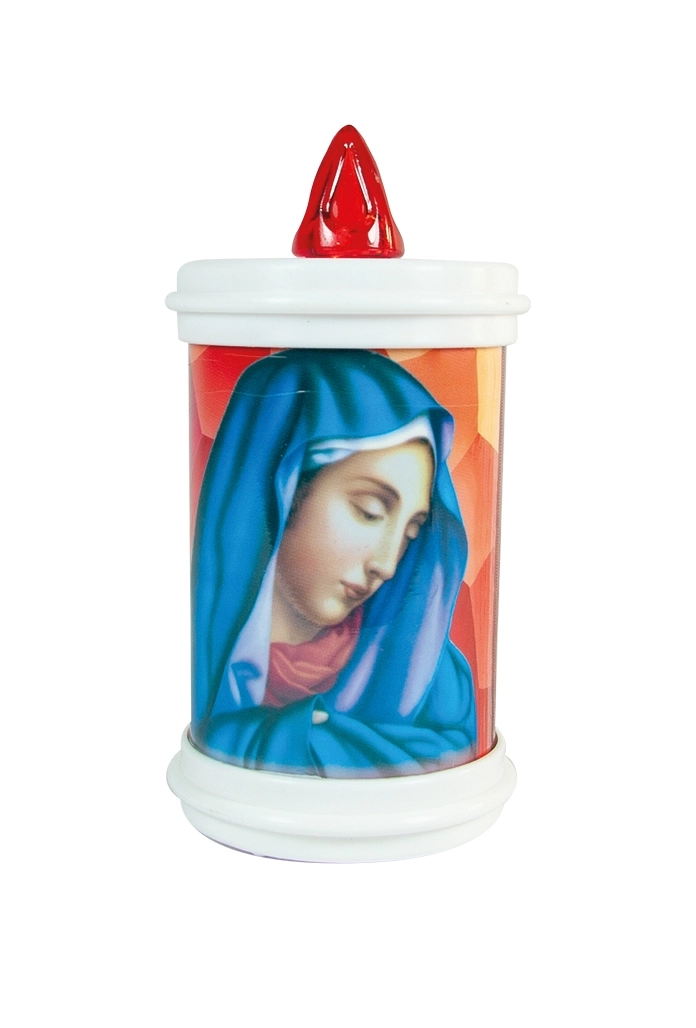 Lumino votivo elettronico, immagine Madonna Addolorata, con durata 120 giorni di fiamma rossa fissa e continuativa. Le batterie sono incluse e NON sono sostituibili. Semplice ed economico, usa e getta. Prodotto da un'azienda italiana con elevata competenza nel settore.