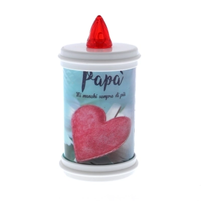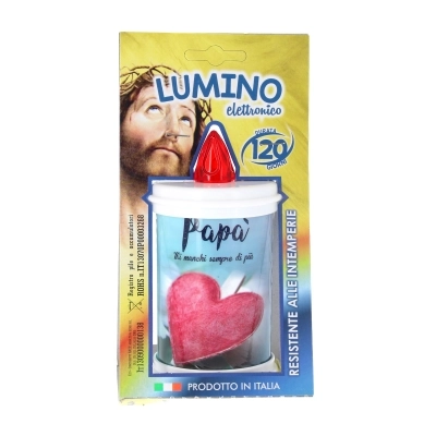 Lumino votivo elettronico Papà, con durata 120 giorni di fiamma rossa fissa e continuativa. Le batterie sono incluse e NON sono sostituibili. Semplice ed economico, usa e getta. Prodotto da un'azienda italiana con elevata competenza nel settore.