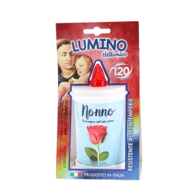 Lumino votivo elettronico Nonno, con durata 120 giorni di fiamma rossa fissa e continuativa. Le batterie sono incluse e NON sono sostituibili. Semplice ed economico, usa e getta. Prodotto da un'azienda italiana con elevata competenza nel settore.