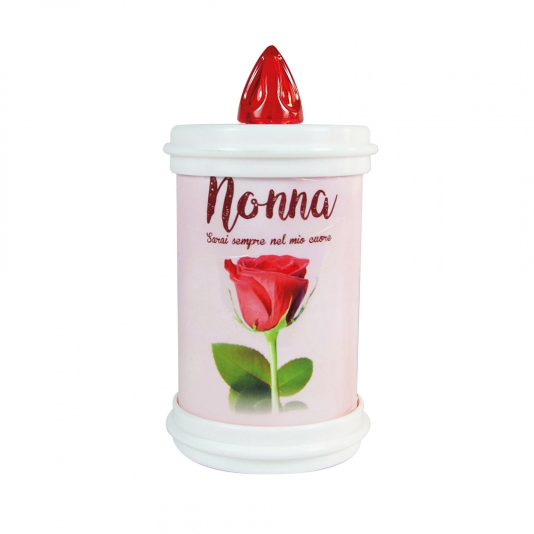 Lumino votivo elettronico Nonna, con durata 120 giorni di fiamma rossa fissa e continuativa. Le batterie sono incluse e NON sono sostituibili. Semplice ed economico, usa e getta. Prodotto da un'azienda italiana con elevata competenza nel settore.