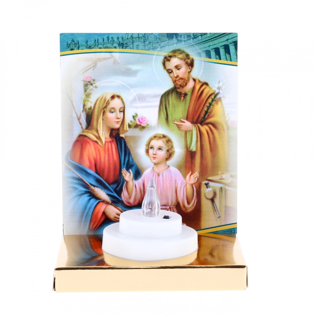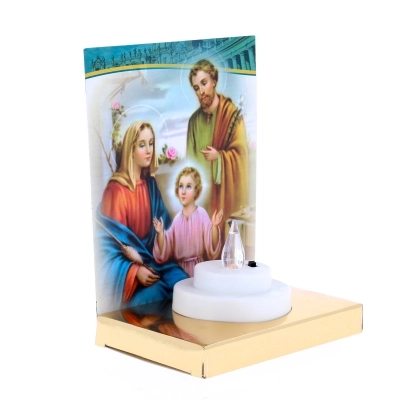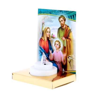 Grazioso altarino in carta con bellissima rappresentazione della Sacra Famiglia e sagomatura rotonda nella parte davanti, in cui è possibile inserire il lumino elettronico Tealights con diametro 5,8 cm. L'altarino è già compreso di lumino elettronico bianco, con luce gialla tremolante che simula la vera fiamma di una candela per 150 giorni. Il lumino ha il tasto di accensione e speginimento, posto vicino alla fiamma.