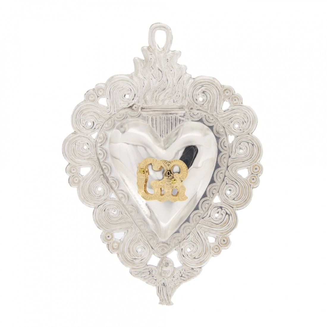 Cuore Votivo (Ex Voto) realizzato interamente in argento 925, con lettere GR (Grazia Ricevuta) in argento dorato. Sulla parte alta, il cuore è dotato di un anellino, che permette di appenderlo in qualsiasi ambiente domestico.