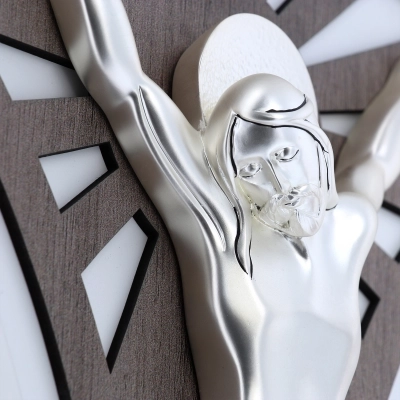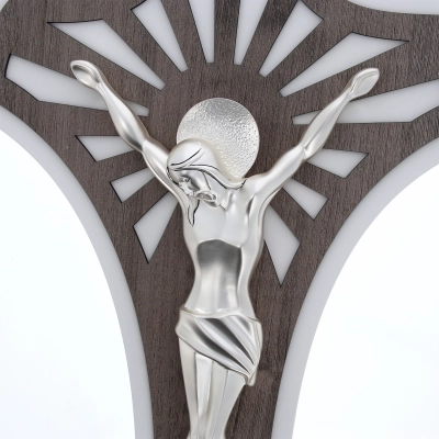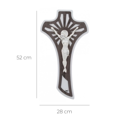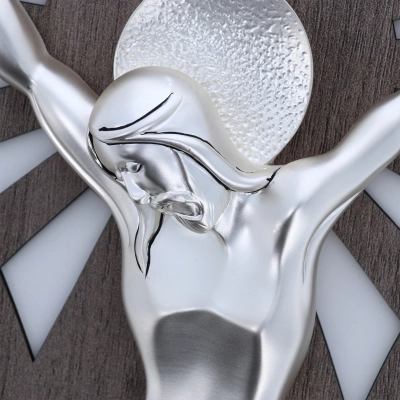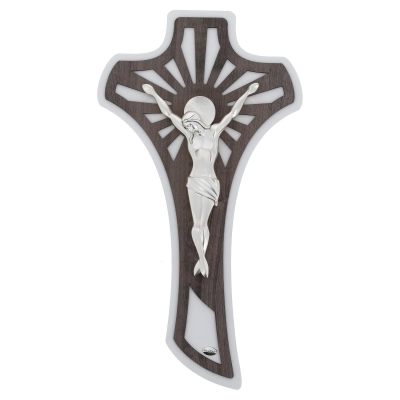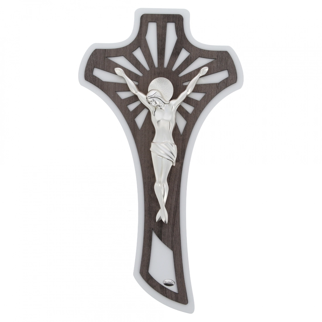 Bellissimo crocifisso, con croce in legno, e corpo di Cristo in resina argentata opaca; lavorato su più livelli, crea un gioco di colore e movimento unici.Dalle linee moderne, questo crocifisso unisce il disegn e il valore spirituale e simbolico che da sempre viene attribuito al crocifisso. Adatto a qualsiasi stile di arredamento, ideati per chi vuole arredare la propria casa con gusto e originalità.