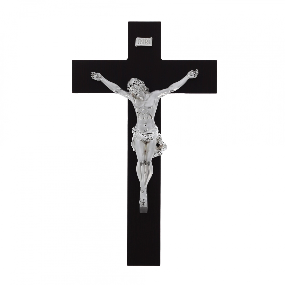 Classico e bellissimo crocifisso in legno scuro con corpo in resina argentata. Questo crocifisso unisce il disegn e il valore spirituale e simbolico che da sempre viene attribuito al crocifisso. Adatto a qualsiasi stile di arredamento. Realizzato in Italia da un'azienda leader nell'ideazione e produzione di articoli per la casa e arredameno in argento.