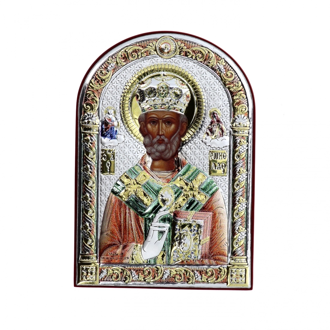 Preziosissima icona, posta su un supporto in legno noce, realizzata in argento Mirò e con i colori tipici dell'iconografia bizantina. L'icona raffigura San Nicola venerato come santo patrono dei marinai, dei mercanti e dei bambini e la sua vita è caratterizzata da atti di generosità e miracoli. Nelle icone bizantine, San Nicola è spesso rappresentato con una mitra vescovile e un pastorale, simboli del suo ruolo di vescovo. E' raffigurato anche con il libro del Vangelo, che sottolinea la sua dedizione alla fede e alla predicazione. L'icona può essere appesa, ma anche appoggiata grazie al piedistallo incluso nella scatola. Rifinita a mano e curata nei dettagli. Realizzata completamente in Italia da un'azienda leader nella produzione di quadri in argento.