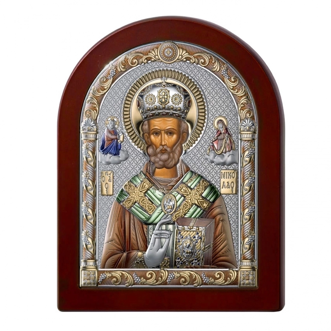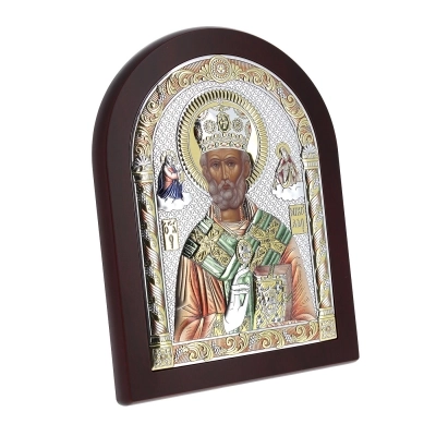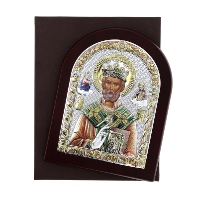 Preziosissima icona, posta su un supporto in legno noce, realizzata in argento Mirò e con i colori tipici dell'iconografia bizantina. L'icona raffigura San Nicola venerato come santo patrono dei marinai, dei mercanti e dei bambini e la sua vita è caratterizzata da atti di generosità e miracoli. Nelle icone bizantine, San Nicola è spesso rappresentato con una mitra vescovile e un pastorale, simboli del suo ruolo di vescovo. E' raffigurato anche con il libro del Vangelo, che sottolinea la sua dedizione alla fede e alla predicazione. L'icona può essere appesa, ma anche appoggiata grazie al piedistallo incluso nella scatola. Rifinita a mano e curata nei dettagli. Realizzata completamente in Italia da un'azienda leader nella produzione di quadri in argento.