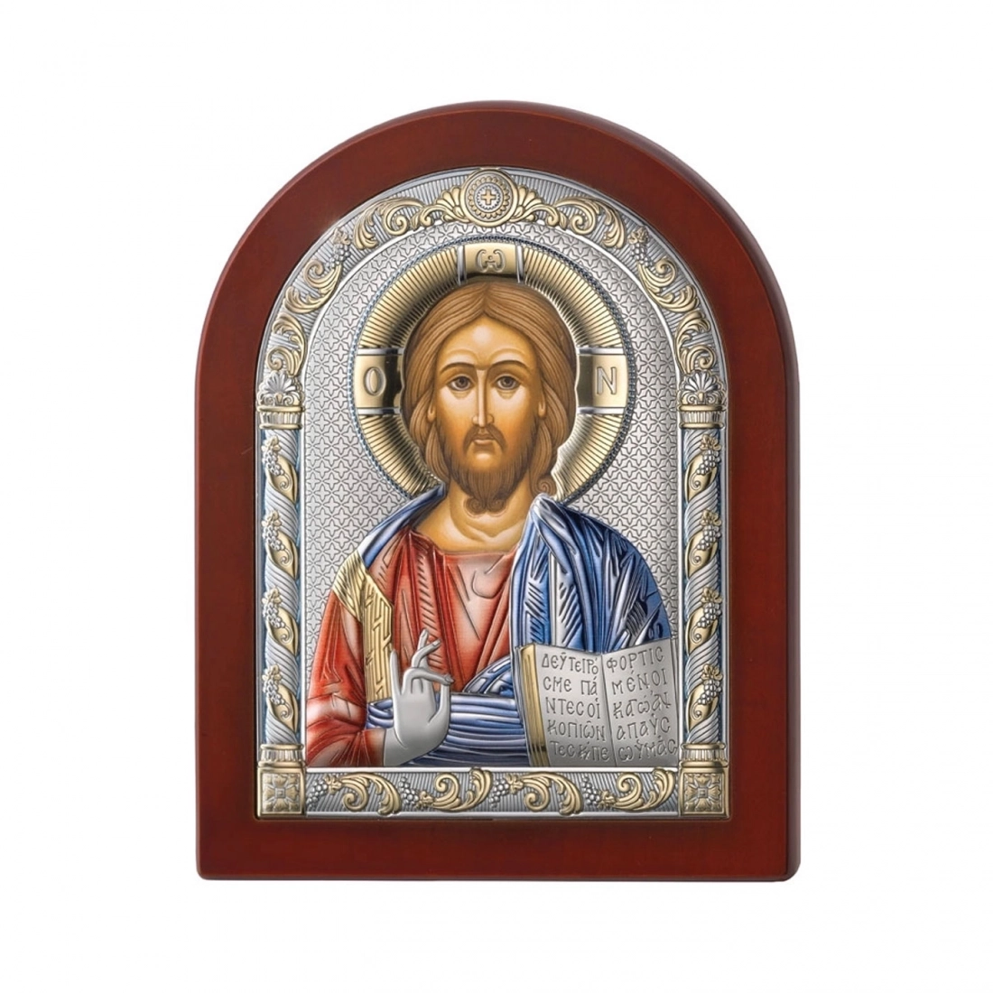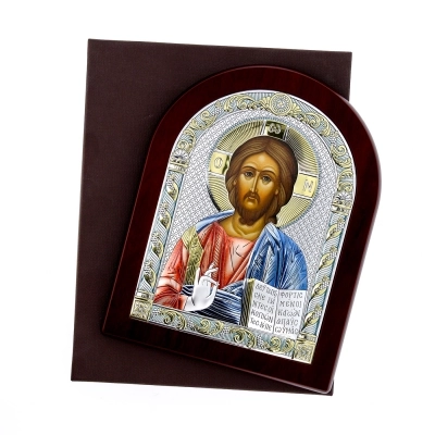 Preziosissima icona, posta su un supporto in legno noce, realizzata in argento Mirò e con i colori tipici dell'iconografia bizantina. L'icona raffigura il Cristo Pantocratore, soggetto molto diffuso e conosciuto, vestito di rosso e in atteggiamento severo e maestoso, seduto su un trono maestoso come un giudice, alla fine dei tempi. L'icona può essere appesa, ma anche appoggiata grazie al piedistallo incluso nella scatola. Rifinita a mano e curata nei dettagli. Realizzata completamente in Italia da un'azienda leader nella produzione di quadri in argento.
