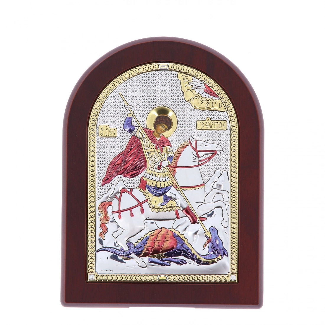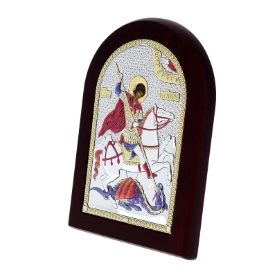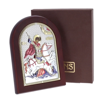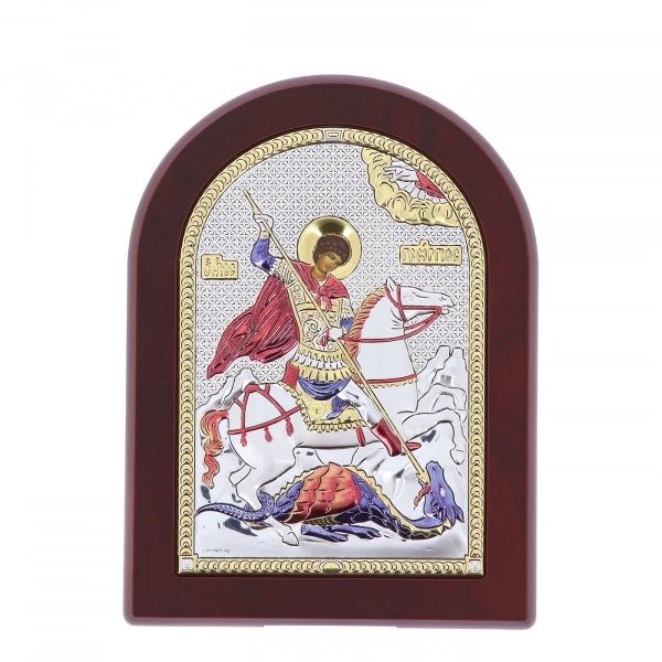 Preziosissima icona, posta su un supporto in legno noce, realizzata in argento Mirò e con i colori tipici dell'iconografia bizantina. L'icona raffigura San Giorgio, rappresentato come un santo guerriero e protettore. San Giorgio è raffigurato in armatura, montato su cavallo, mentre con una lancia combatte e trafigge un drago, simbolo del male e dell'ignoranza. Questa iconografia rappresenta la vittoria del bene sul male e la fede cristiana che trionfa sulle forze avverse, oltre a celebrare il martirio del santo. L'icona può essere appesa, ma anche appoggiata grazie al piedistallo incluso nella scatola. Rifinita a mano e curata nei dettagli. Realizzata completamente in Italia da un'azienda leader nella produzione di quadri in argento.