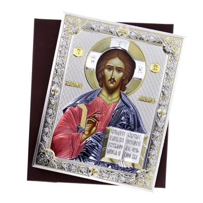 Preziosissima icona, posta su un supporto in legno noce, realizzata in argento Mirò e con i colori tipici dell'iconografia bizantina. L'icona raffigura il Cristo Pantocratore, soggetto molto diffuso e conosciuto, vestito di rosso e in atteggiamento severo e maestoso, seduto su un trono maestoso come un giudice, alla fine dei tempi. L'icona può essere appesa, ma anche appoggiata grazie al piedistallo incluso nella scatola. Rifinita a mano e curata nei dettagli. Realizzata completamente in Italia da un'azienda leader nella produzione di quadri in argento.