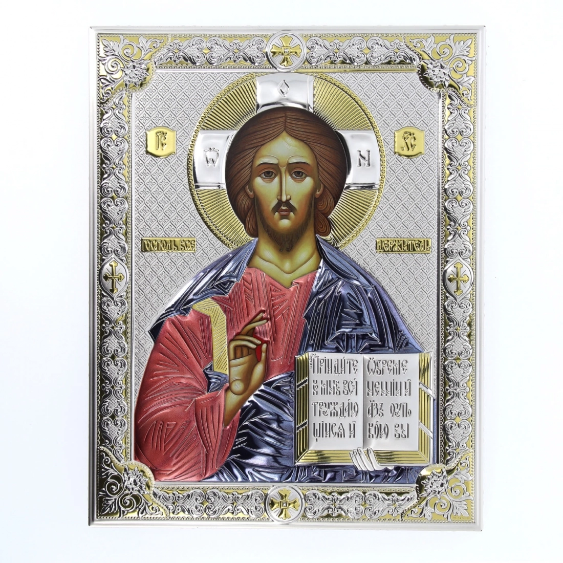Preziosissima icona, posta su un supporto in legno noce, realizzata in argento Mirò e con i colori tipici dell'iconografia bizantina. L'icona raffigura il Cristo Pantocratore, soggetto molto diffuso e conosciuto, vestito di rosso e in atteggiamento severo e maestoso, seduto su un trono maestoso come un giudice, alla fine dei tempi. L'icona può essere appesa, ma anche appoggiata grazie al piedistallo incluso nella scatola. Rifinita a mano e curata nei dettagli. Realizzata completamente in Italia da un'azienda leader nella produzione di quadri in argento.