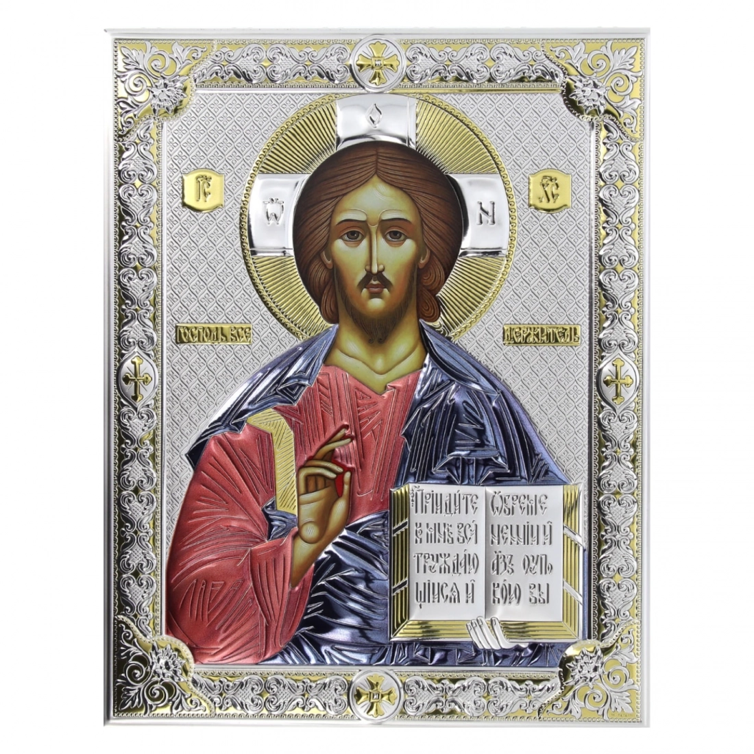 Preziosissima icona, posta su un supporto in legno noce, realizzata in argento Mirò e con i colori tipici dell'iconografia bizantina. L'icona raffigura il Cristo Pantocratore, soggetto molto diffuso e conosciuto, vestito di rosso e in atteggiamento severo e maestoso, seduto su un trono maestoso come un giudice, alla fine dei tempi. L'icona può essere appesa, ma anche appoggiata grazie al piedistallo incluso nella scatola. Rifinita a mano e curata nei dettagli. Realizzata completamente in Italia da un'azienda leader nella produzione di quadri in argento.