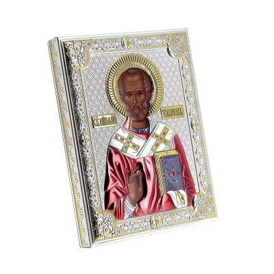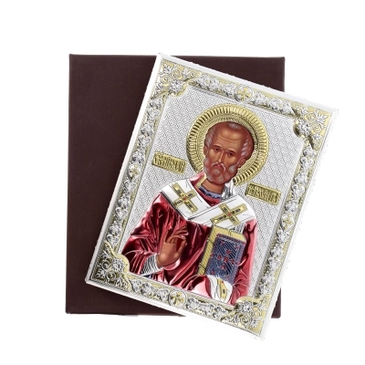 Preziosissima icona, posta su un supporto in legno noce, realizzata in argento Mirò e con i colori tipici dell'iconografia bizantina. L'icona raffigura San Nicola venerato come santo patrono dei marinai, dei mercanti e dei bambini e la sua vita è caratterizzata da atti di generosità e miracoli. Nelle icone bizantine, San Nicola è spesso rappresentato con una mitra vescovile e un pastorale, simboli del suo ruolo di vescovo. E' raffigurato anche con il libro del Vangelo, che sottolinea la sua dedizione alla fede e alla predicazione. L'icona può essere appesa, ma anche appoggiata grazie al piedistallo incluso nella scatola. Rifinita a mano e curata nei dettagli. Realizzata completamente in Italia da un'azienda leader nella produzione di quadri in argento.