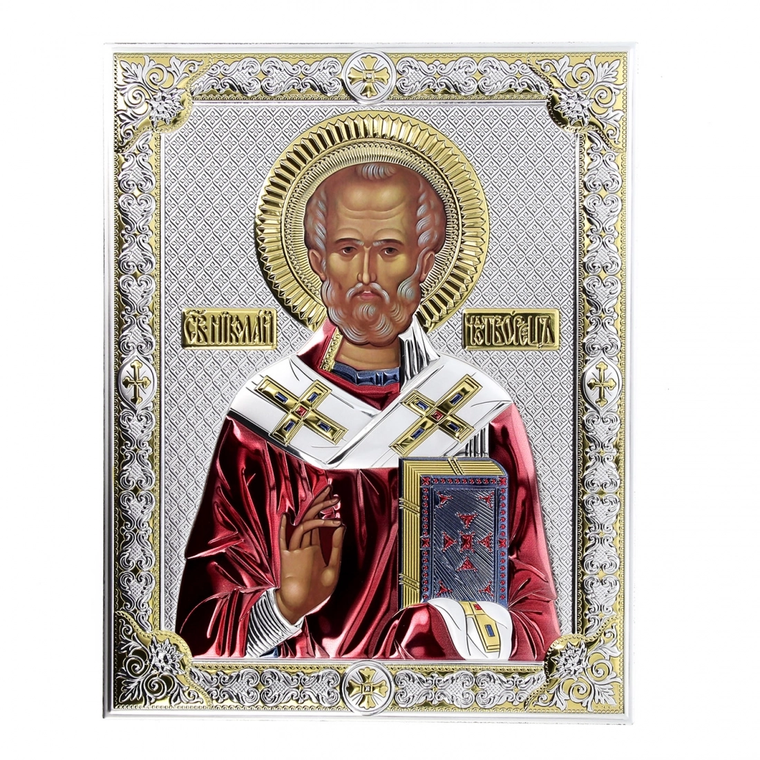 Preziosissima icona, posta su un supporto in legno noce, realizzata in argento Mirò e con i colori tipici dell'iconografia bizantina. L'icona raffigura San Nicola venerato come santo patrono dei marinai, dei mercanti e dei bambini e la sua vita è caratterizzata da atti di generosità e miracoli. Nelle icone bizantine, San Nicola è spesso rappresentato con una mitra vescovile e un pastorale, simboli del suo ruolo di vescovo. E' raffigurato anche con il libro del Vangelo, che sottolinea la sua dedizione alla fede e alla predicazione. L'icona può essere appesa, ma anche appoggiata grazie al piedistallo incluso nella scatola. Rifinita a mano e curata nei dettagli. Realizzata completamente in Italia da un'azienda leader nella produzione di quadri in argento.