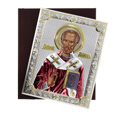 Preziosissima icona, posta su un supporto in legno noce, realizzata in argento Mirò e con i colori tipici dell'iconografia bizantina. L'icona raffigura San Nicola venerato come santo patrono dei marinai, dei mercanti e dei bambini e la sua vita è caratterizzata da atti di generosità e miracoli. Nelle icone bizantine, San Nicola è spesso rappresentato con una mitra vescovile e un pastorale, simboli del suo ruolo di vescovo. E' raffigurato anche con il libro del Vangelo, che sottolinea la sua dedizione alla fede e alla predicazione. L'icona può essere appesa, ma anche appoggiata grazie al piedistallo incluso nella scatola. Rifinita a mano e curata nei dettagli. Realizzata completamente in Italia da un'azienda leader nella produzione di quadri in argento.