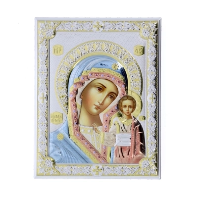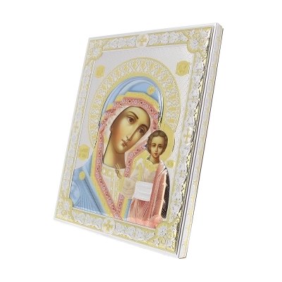 Preziosissima icona, posta su un supporto in legno noce, realizzata in argento Mirò e con i colori tipici dell'iconografia bizantina. L'icona raffigura la Madonna con il Bambino Gesù in braccio, sottolineando la sua maternità divina e il suo ruolo centrale nella storia della salvezza. Inoltre, la raffigurazione della Madre di Dio nelle icone serve, oltre che come opera d'arte, anche come strumento di meditazione e preghiera, invitando i fedeli a riflettere sulla sua importanza nella fede cristiana. L'icona può essere appesa, ma anche appoggiata grazie al piedistallo incluso nella scatola. Rifinita a mano e curata nei dettagli. Realizzata completamente in Italia da un'azienda leader nella produzione di quadri in argento.