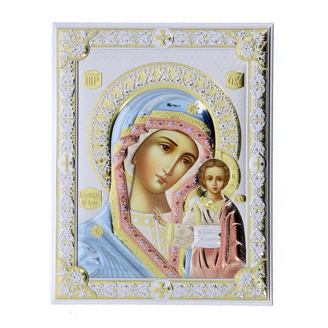 Preziosissima icona, posta su un supporto in legno noce, realizzata in argento Mirò e con i colori tipici dell'iconografia bizantina. L'icona raffigura la Madonna con il Bambino Gesù in braccio, sottolineando la sua maternità divina e il suo ruolo centrale nella storia della salvezza. Inoltre, la raffigurazione della Madre di Dio nelle icone serve, oltre che come opera d'arte, anche come strumento di meditazione e preghiera, invitando i fedeli a riflettere sulla sua importanza nella fede cristiana. L'icona può essere appesa, ma anche appoggiata grazie al piedistallo incluso nella scatola. Rifinita a mano e curata nei dettagli. Realizzata completamente in Italia da un'azienda leader nella produzione di quadri in argento.