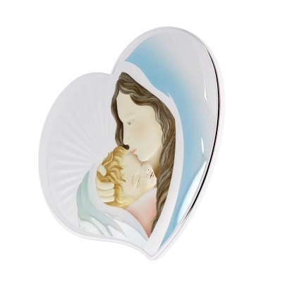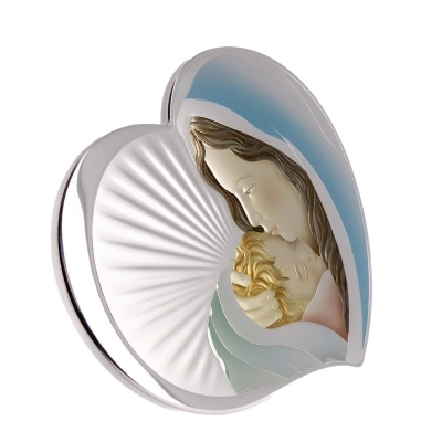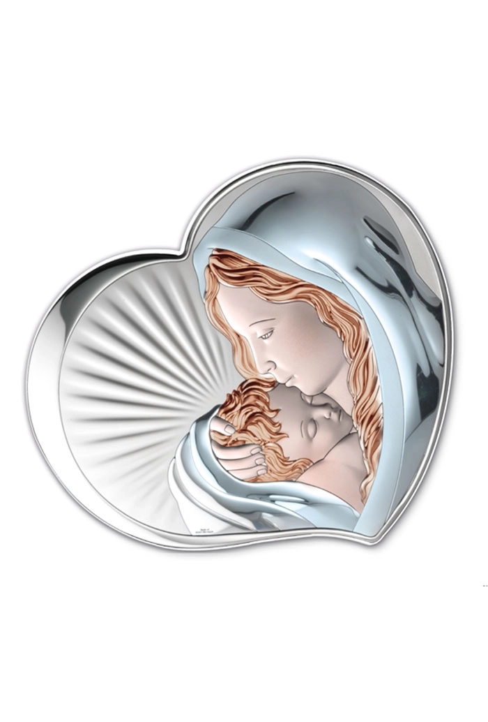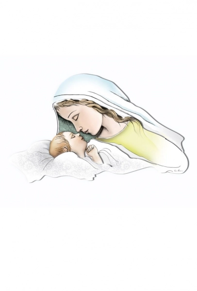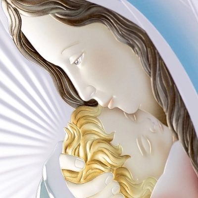 Elegante quadro in argento con dettagli colorati che rappresenta la Madonna con Bambino. Realizzato in Mirò silver, un nuovo metallo con trattamento superficiale che include uno strato di argento puro 999.95% che conferisce al rivestimento soliditá e resistenza all’ossidazione superiore rispetto ai piu’ comuni rivestimenti in metalli preziosi. Il retro del quadro è in legno bianco e può essere sia appeso che da appoggio grazie alla basetta in dotazione. Il quadro "Madonna con Bambino" è un tema molto comune nella storia dell'arte, raffigurante la Madonna Maria con il Bambino Gesù. Questo soggetto è stato dipinto da numerosi artisti famosi nel corso dei secoli, come ad esempio Leonardo da Vinci, Raffaello e Michelangelo. Queste opere d'arte sono spesso considerate sacre e hanno un significato spirituale profondo per molti credenti. Dimensioni 38x33,5 cm