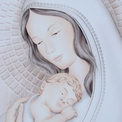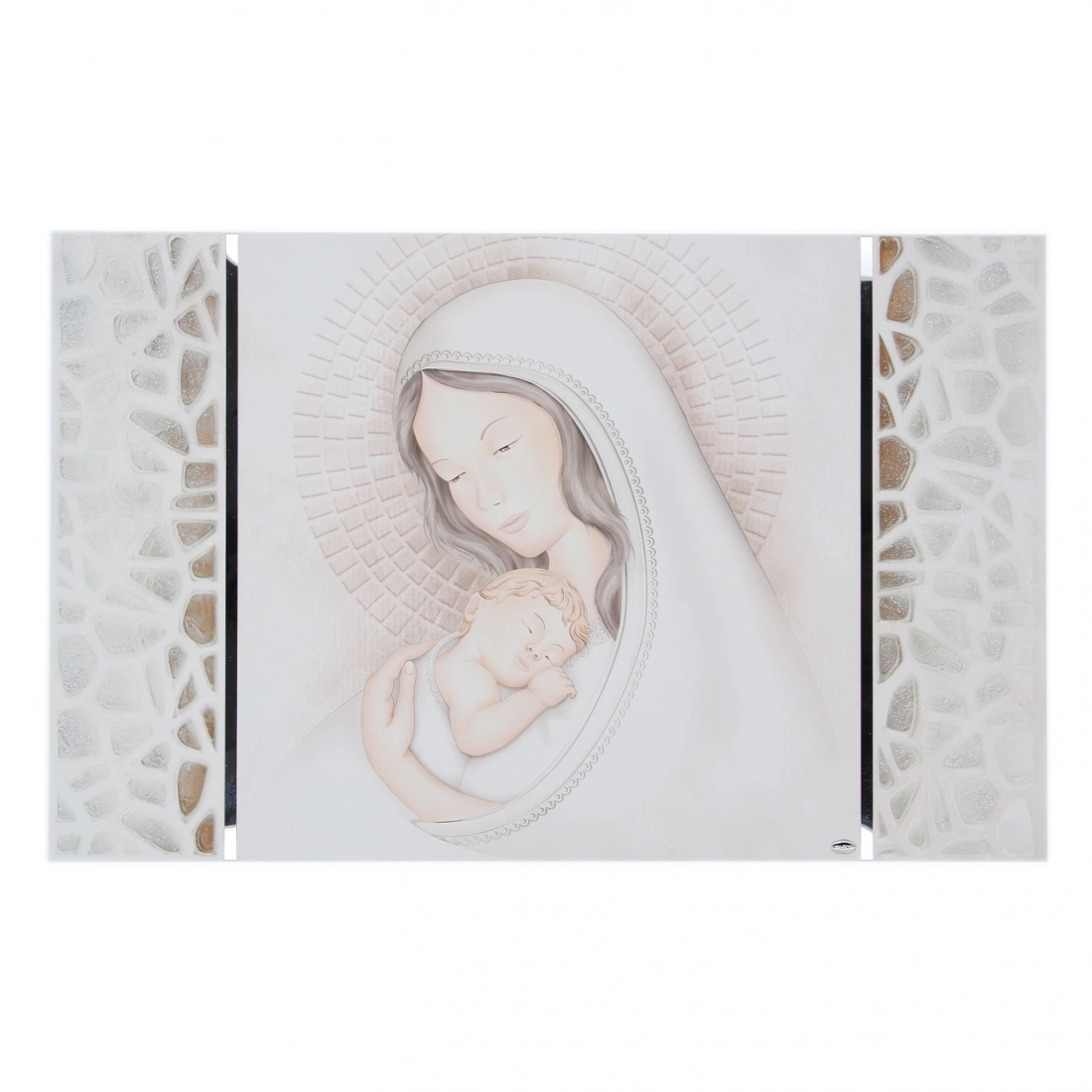 Elegante quadro che raffigura la Madonna con Bambino. La particolarità di questo quadro sono i colori pastello, i dettagli argentati e le decorazioni stile mosaico a rilievo ai lati del quadro. Il quadro "Madonna con Bambino" è un tema molto comune nella storia dell'arte, raffigurante la Madonna Maria con il Bambino Gesù. Questo soggetto è stato dipinto da numerosi artisti famosi nel corso dei secoli, come ad esempio Leonardo da Vinci, Raffaello e Michelangelo. Queste opere d'arte sono spesso considerate sacre e hanno un significato spirituale profondo per molti credenti. Bella idea regalo per un matrimonio o per una nascita. Dimensioni 80x52 cm.
