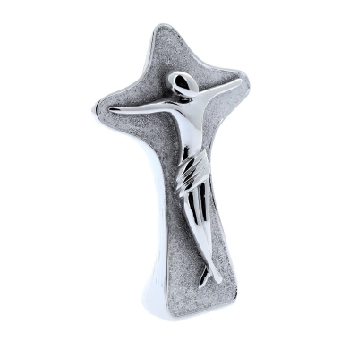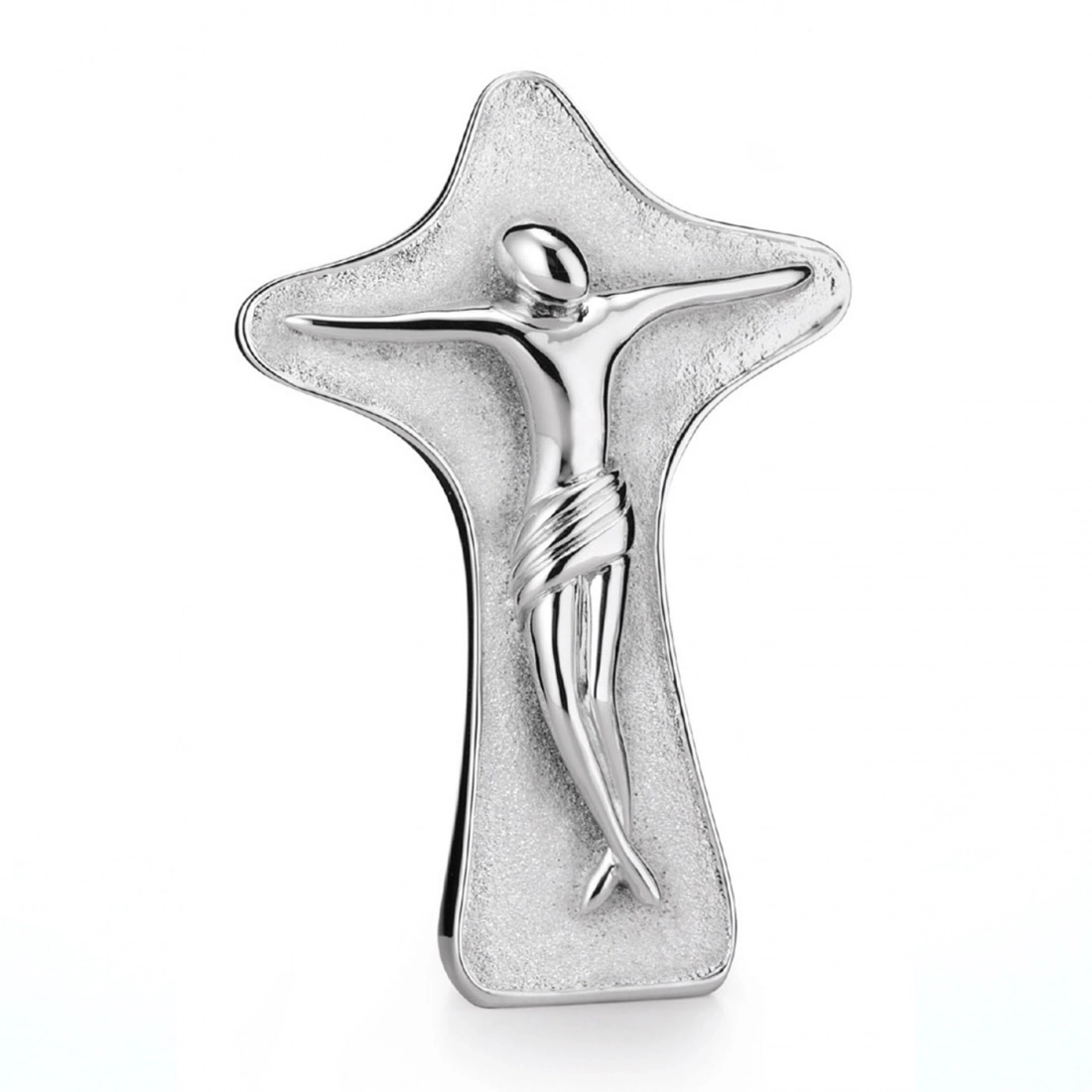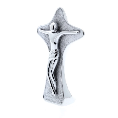 Crocifisso da appoggio in resina argentata, con corpo stilizzato. Il contrasto tra l'argentatura lucida e quella satinata, conferisce al prodotto profondità e movimento. Dalle linee morbide, si adatta a qualsiasi tipologia di arredamento dai più classici a quelli più moderni. Realizzato totalmente in Italia da un'azienda leader nella produzione di quadri e oggettistica in argento.