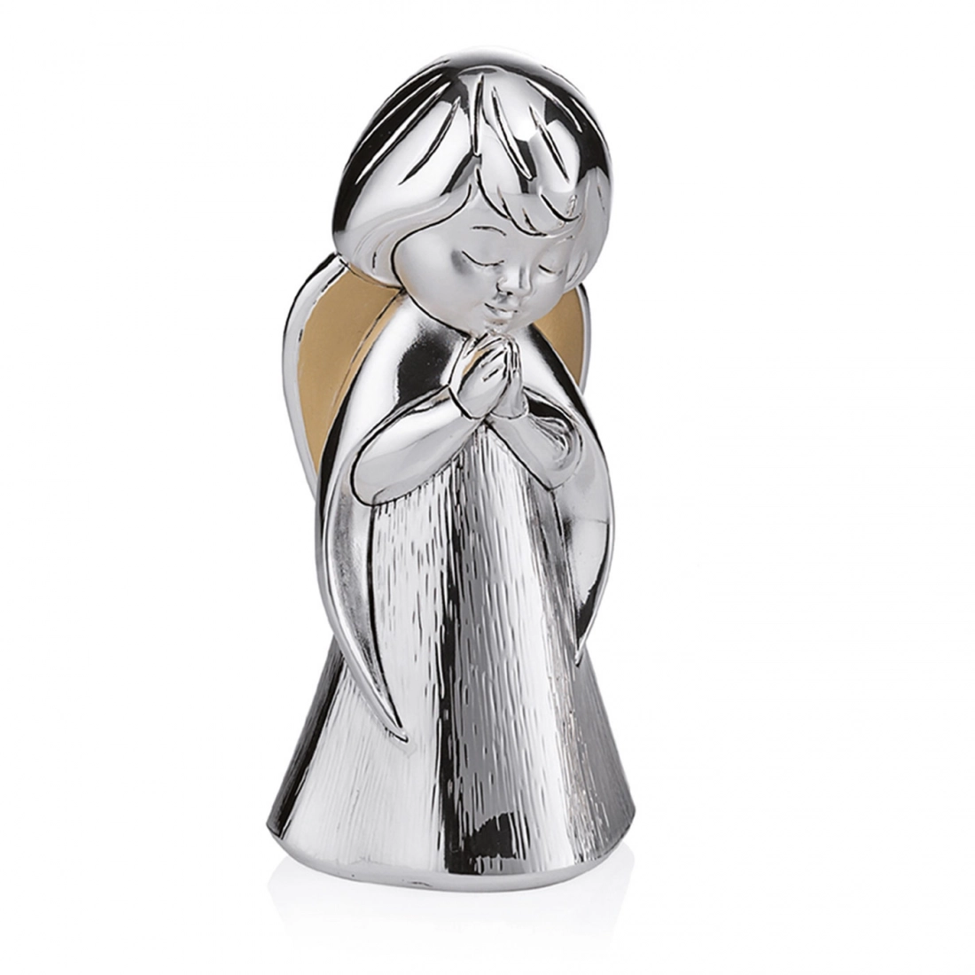 Statua Angelo in preghiera, realizzata in resina argentata con decorazione dei dettagli dorati, che donano movimento al prodotto. Ideale da regalare in qualsiasi occasione per augurare a chi lo riceve la protezione dell'Angelo. Dalle linee morbide, si adatta a qualsiasi tipologia di arredamento dai più classici a quelli più moderni. Realizzato totalmente in Italia da un'azienda leader nella produzione di quadri e oggettistica in argento.