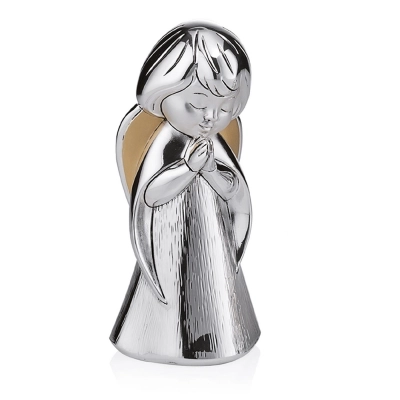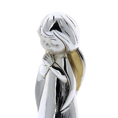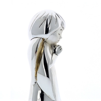 Statua Angelo in preghiera, realizzata in resina argentata con decorazione dei dettagli dorati, che donano movimento al prodotto. Ideale da regalare in qualsiasi occasione per augurare a chi lo riceve la protezione dell'Angelo. Dalle linee morbide, si adatta a qualsiasi tipologia di arredamento dai più classici a quelli più moderni. Realizzato totalmente in Italia da un'azienda leader nella produzione di quadri e oggettistica in argento.