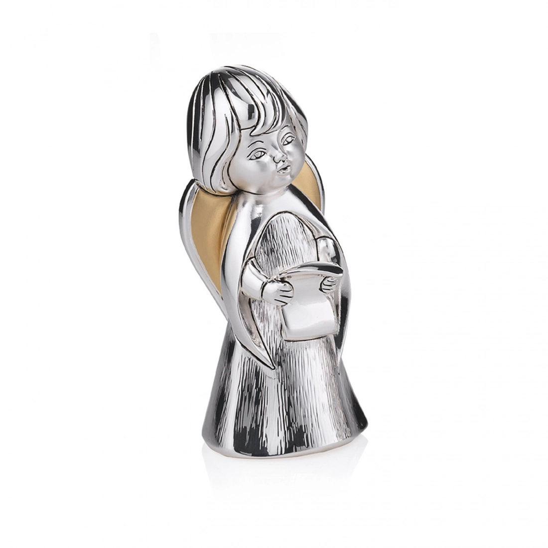 Statua Angelo, raffigurato con lo spartito in mano come a cantare, simbolo di gioia e armonia. Realizzata in resina argentata con decorazione dei dettagli dorati, che donano movimento al prodotto. Ideale da regalare in qualsiasi occasione per augurare a chi lo riceve la protezione dell'Angelo. Dalle linee morbide, si adatta a qualsiasi tipologia di arredamento dai più classici a quelli più moderni. Realizzato totalmente in Italia da un'azienda leader nella produzione di quadri e oggettistica in argento.