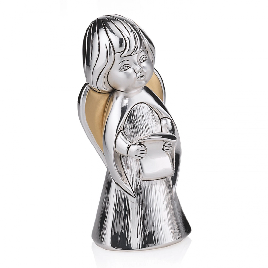 Statua Angelo, raffigurato con lo spartito in mano come a cantare, simbolo di gioia e armonia. Realizzata in resina argentata con decorazione dei dettagli dorati, che donano movimento al prodotto. Ideale da regalare in qualsiasi occasione per augurare a chi lo riceve la protezione dell'Angelo. Dalle linee morbide, si adatta a qualsiasi tipologia di arredamento dai più classici a quelli più moderni. Realizzato totalmente in Italia da un'azienda leader nella produzione di quadri e oggettistica in argento.
