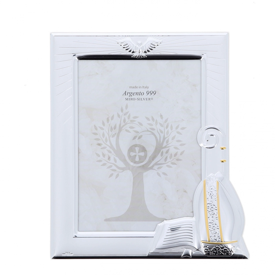 Cornice portafoto in argento con retro in legno bianco. In basso a destra la cornice presenta la simbologia tipica della Cresima, ossia il pastorale, la mitra e la Bibbia. In alto e al centro del porta foto è presente la Colomba, simbolo dello Spirito Santo e dei suoi sette doni, che riceveranno i ragazzi durante il Sacramento della Cresima, il tutto con decorazioni dorate che rendono il prodotto molto fine ed elegante. La cornice può ospitare foto di formato 13x18 cm. Ideale da regalare in occasione della Cresima. Realizzato in Italia da un'azienda leader nella produzione di quadri e oggettistica da regalo in argento.