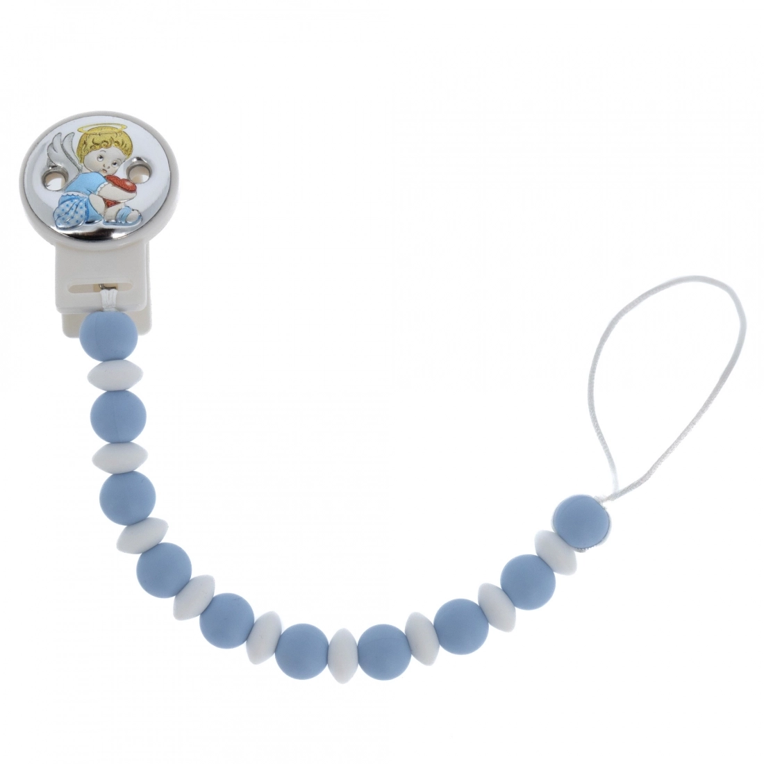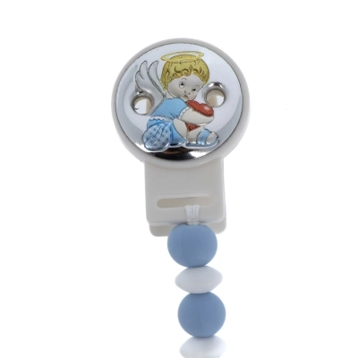 Clip portaciuccio in plastica bianca con applicazione di una placchetta in argento raffigurante un Angioletto con un cuore in braccio, corredata da una catenella in silicone alimentare, per la dentizione del bambino, con sfere di diametro 1 cm alternate da altre sfere piatte bianche. Al termine della catenella è presente un nastrino bianco in cui è possibile appendere il ciuccio del bambino. Ideale da regalare in occasione di una Nascita. Realizzato in Italia da un'azienda leader nella produzione di quadri e oggettistica da regalo in argento.