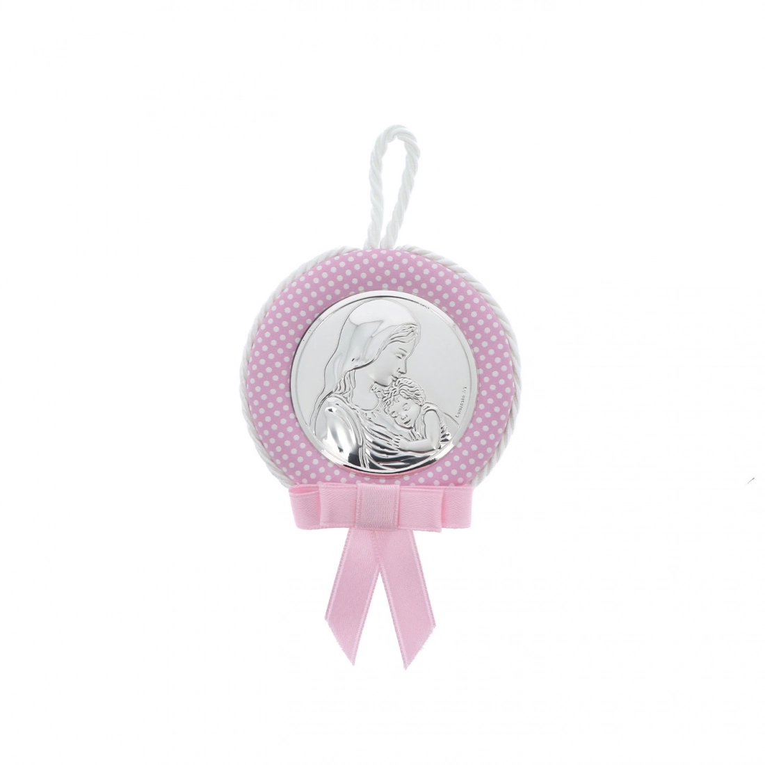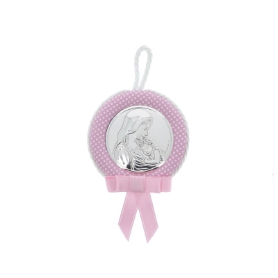 Capoculla in ecopelle rosa, con placca tonda in argento laminato raffigurante la Madonna con Gesù Bambino in braccio. Confezionato nella sua scatolina originale e corredato da certificazione del produttore, è un'ottima idea regalo in occasione di una nascita o di un Battesimo. Realizzato in Italia da un'azienda leader per la produzione di quadri e oggettistica da regalo in argento.