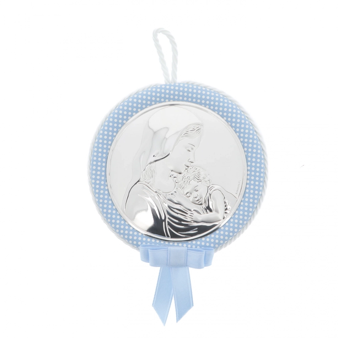 Capoculla in ecopelle celeste, con placca tonda in argento laminato raffigurante la Madonna con Gesù Bambino in braccio. Premendo al centro del capoculla si attiva un carillon dal suono dolce e delicato. Confezionato nella sua scatolina originale e corredato da certificazione del produttore, è un'ottima idea regalo in occasione di una nascita o di un Battesimo. Realizzato in Italia da un'azienda leader per la produzione di quadri e oggettistica da regalo in argento.