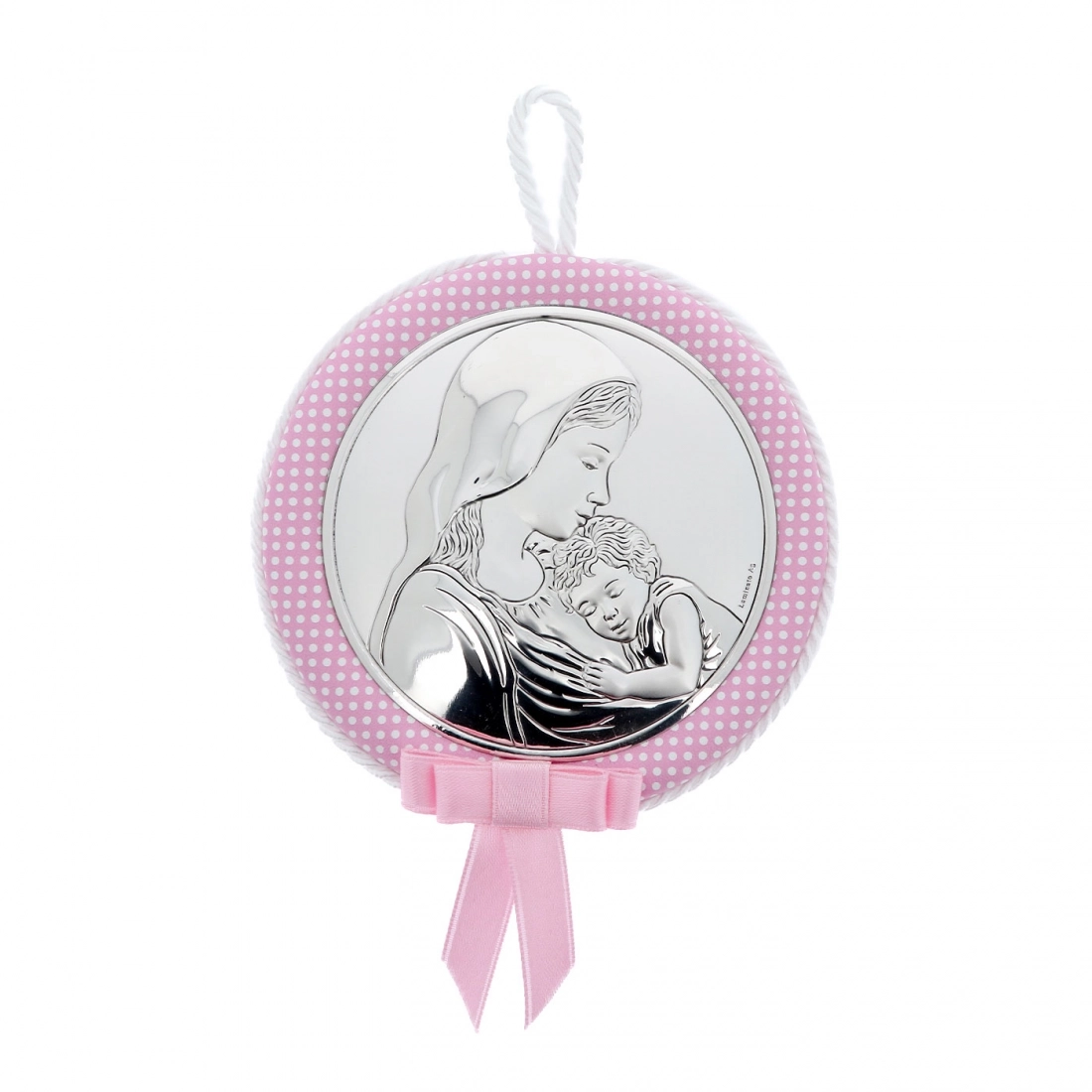 Capoculla in ecopelle rosa, con placca tonda in argento laminato raffigurante la Madonna con Gesù Bambino in braccio. Premendo al centro del capoculla si attiva un carillon dal suono dolce e delicato. Confezionato nella sua scatolina originale e corredato da certificazione del produttore, è un'ottima idea regalo in occasione di una nascita o di un Battesimo. Realizzato in Italia da un'azienda leader per la produzione di quadri e oggettistica da regalo in argento.