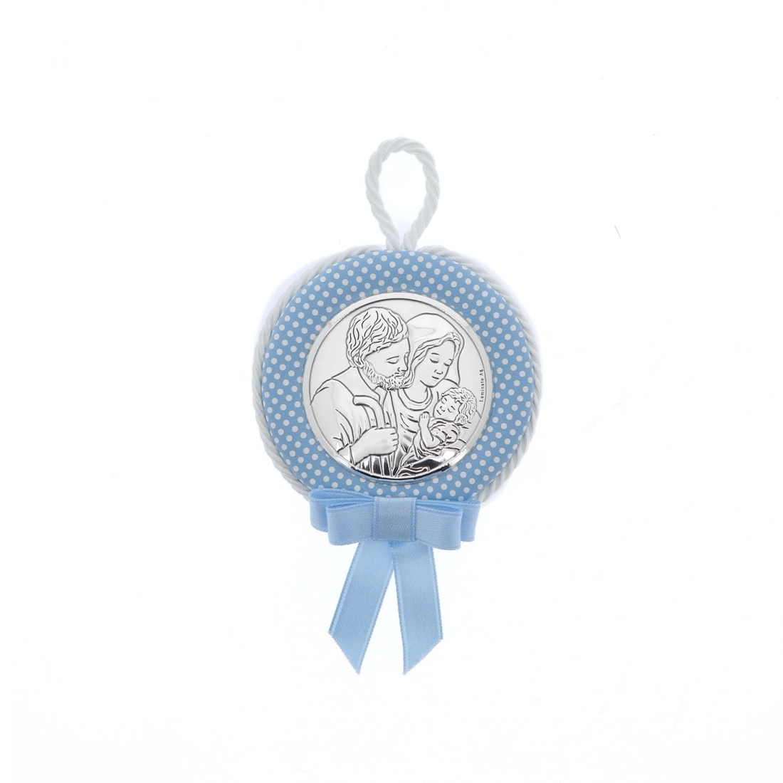 Capoculla in ecopelle celeste, con placca tonda in argento laminato raffigurante la Sacra Famiglia. Confezionato nella sua scatolina originale e corredato da certificazione del produttore, è un'ottima idea regalo in occasione di una nascita o di un Battesimo. Realizzato in Italia da un'azienda leader per la produzione di quadri e oggettistica da regalo in argento.