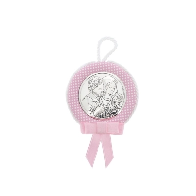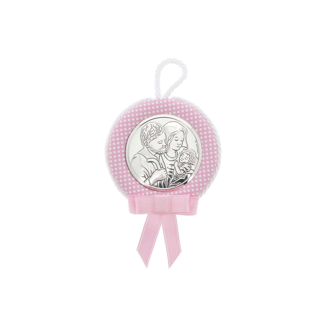 Capoculla in ecopelle rosa, con placca tonda in argento laminato raffigurante la Sacra Famiglia. Confezionato nella sua scatolina originale e corredato da certificazione del produttore, è un'ottima idea regalo in occasione di una nascita o di un Battesimo. Realizzato in Italia da un'azienda leader per la produzione di quadri e oggettistica da regalo in argento.