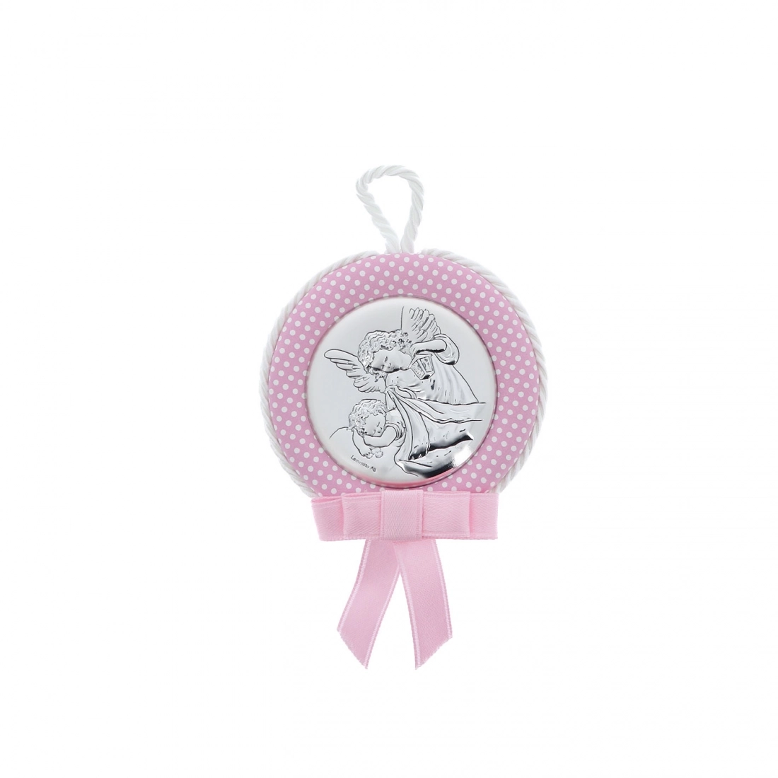 Capoculla in ecopelle rosa, con placca tonda in argento laminato raffigurante l' Angelo Custode. Confezionato nella sua scatolina originale e corredato da certificazione del produttore, è un'ottima idea regalo in occasione di una nascita o di un Battesimo. Realizzato in Italia da un'azienda leader per la produzione di quadri e oggettistica da regalo in argento.