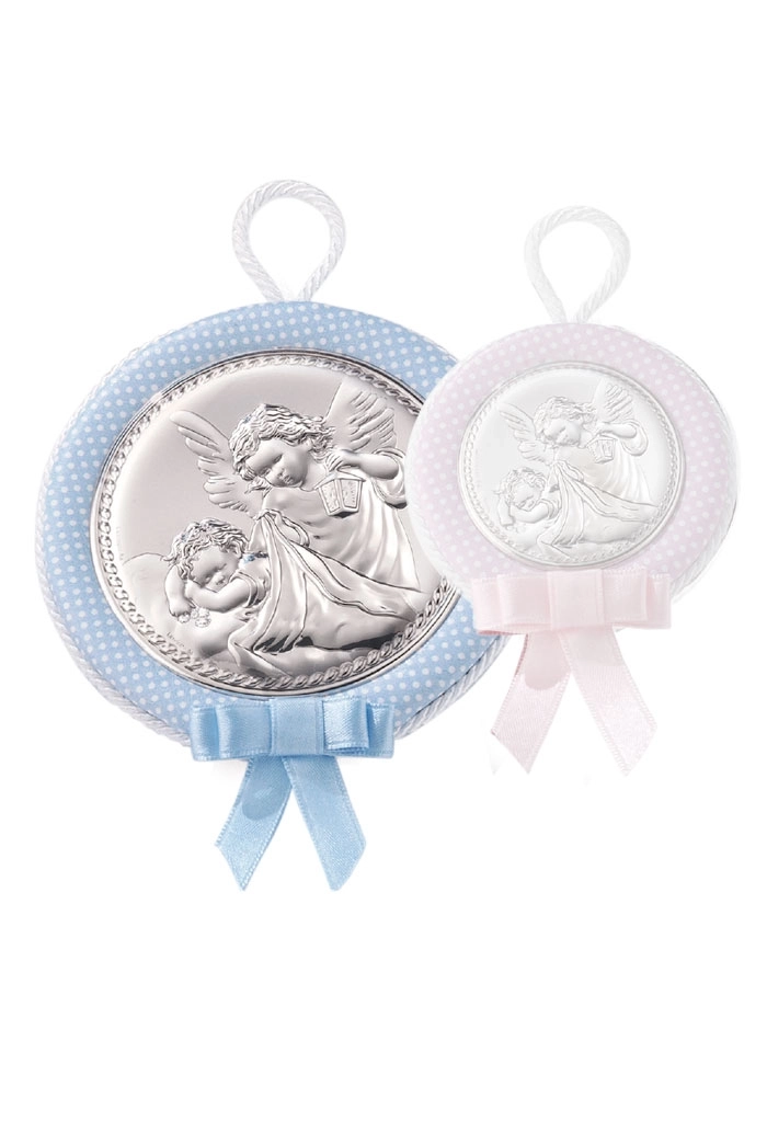 Capoculla in ecopelle celeste, con placca tonda in argento laminato raffigurante l'Angelo Custode. Premendo al centro del capoculla si attiva un carillon dal suono dolce e delicato. Confezionato nella sua scatolina originale e corredato da certificazione del produttore, è un'ottima idea regalo in occasione di una nascita o di un Battesimo. Realizzato in Italia da un'azienda leader per la produzione di quadri e oggettistica da regalo in argento.