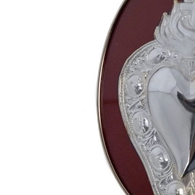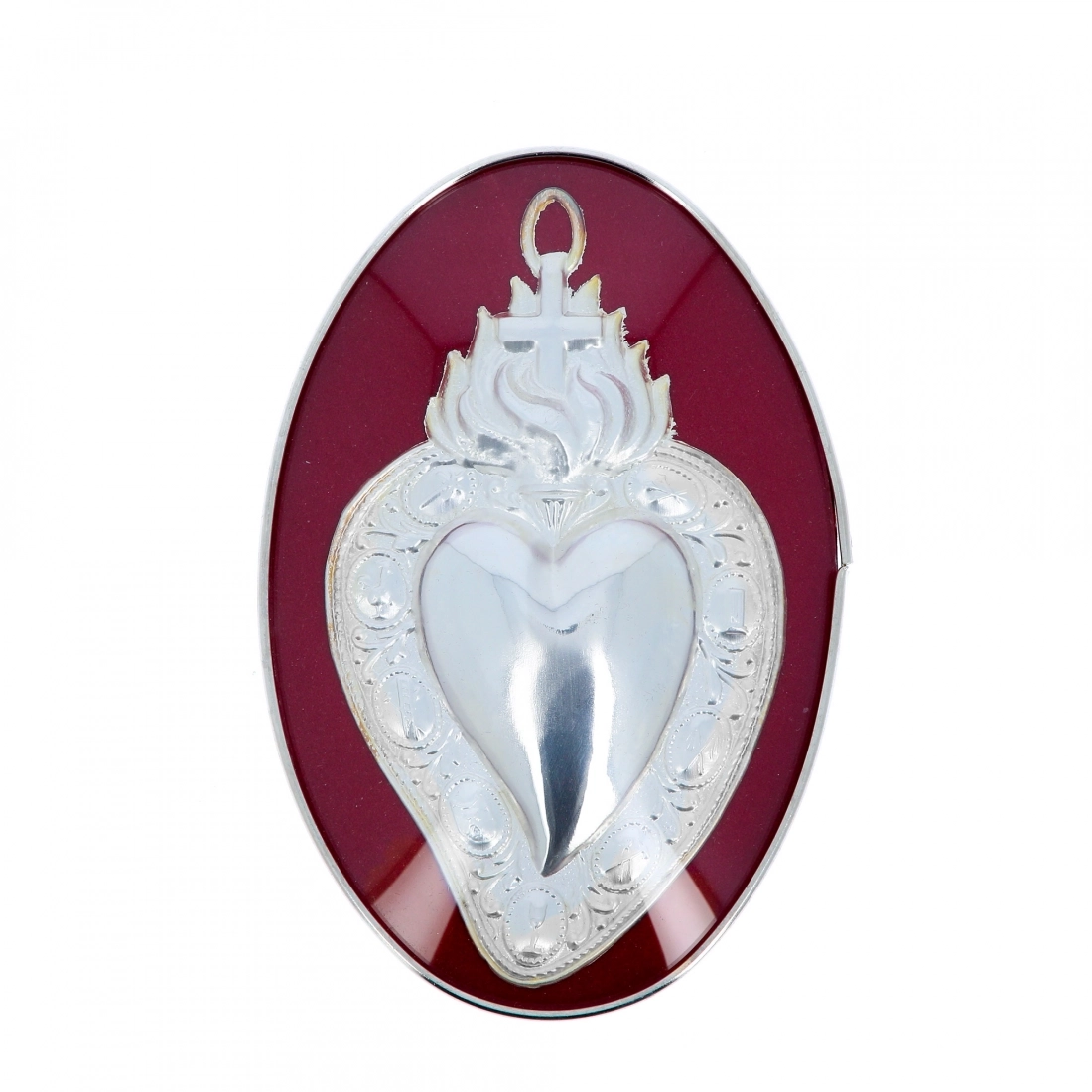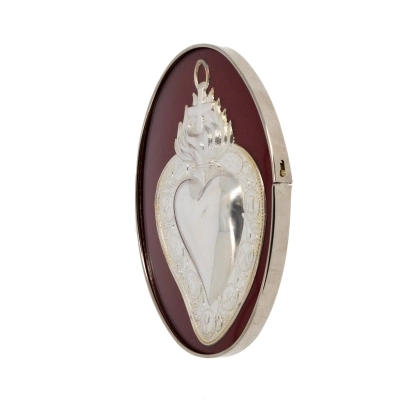 Quadretto con Cuore Votivo (Ex Voto) realizzato in metallo argentato, con fiamma e croce sulla parte alta, posizionato su sfondo in velluto rosso. Si definisce Cuore Votivo Passione, perchè sul bordo ci sono raffigurati 9 simboli tutti inerenti alla Passione di Gesù. Questo piccolo quadro è dotato di gancio, posto sul retro, che permette di appenderlo in qualsiasi ambiente domestico.