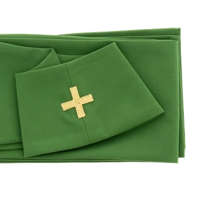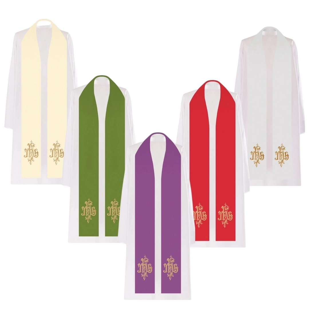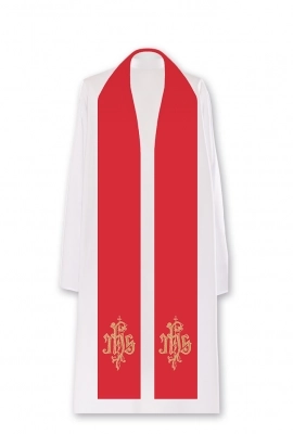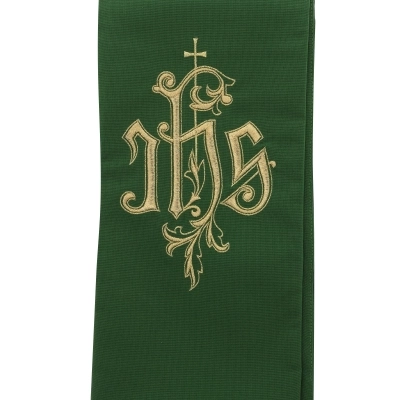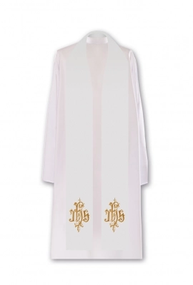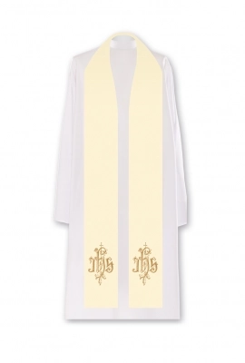 Stola sacerdotale realizzata in tessuto composto da 80% poliestere e 20% lana, con finitura monocolore e un ricamo semplice ma elegante dorato con simbolo JHS. Disponibile nei 4 colori liturgici. La lunghezza complessiva della stola è di 256 cm, quando indossata arriva ben oltre il ginocchio. Realizzata in Polonia da un'azienda specializzata nella confezione di paramenti sacri.