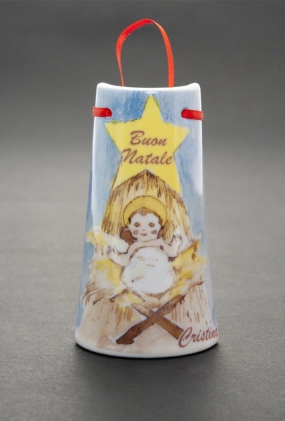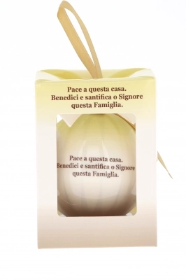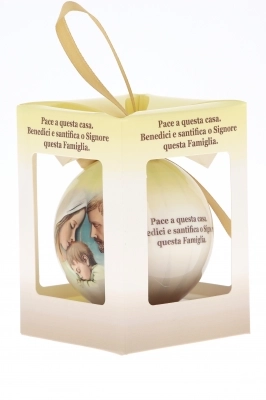 Pallina natalizia (del diametro di 7,5 cm) inserita all'interno di una bella confezione in cartoncino (dalle misure 10,5x8 cm) che la rende adatta per essere regalata. Sulla pallina è presente la rappresentazione della Santa Famiglia e la frase: "Pace a questa casa. Benedici e santifica o Signore questa Famiglia". Bellissimo articolo da acquistare per sé stessi, per arricchire il proprio albero di natale con oggetti sacri o da regalare a qualcuno di speciale per augurargli un sereno Natale da trascorrere insieme alla cosa più preziosa: la famiglia.